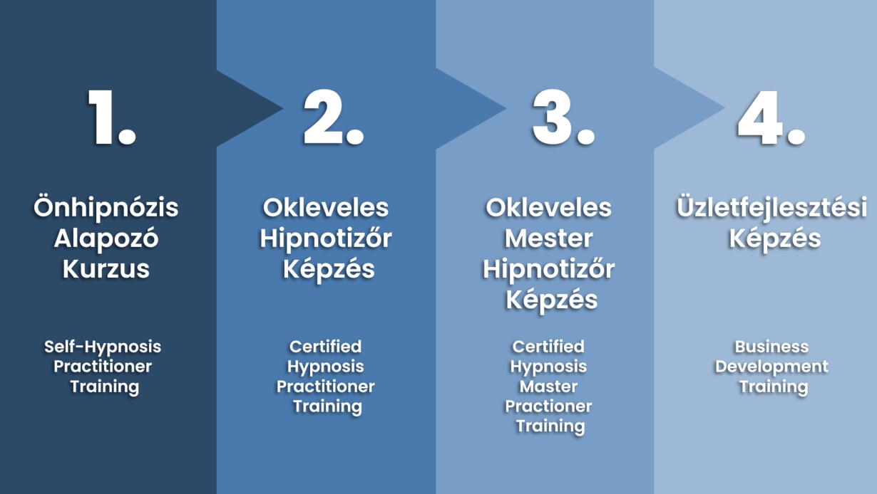 Képzési rendszerünk három, egymásra épülő pilléren nyugszik. Az első a Szakmai Alapképzés, amely során a résztvevők elsajátíthatják az önhipnózis módszereit, valamint mások hipnózisának alapjait, megalapozva ezzel egy önálló hipnoterápiás praxis kialakítását. A második pillért a Haladó Szakirányú Kurzusok jelentik, ahol a hallgatók különböző szakterületeken mélyíthetik el tudásukat és specializálódhatnak. A harmadik, legmagasabb szintet a Mesterkurzusok – más néven Masterclass programok – képviselik, amelyek a hipnózis területén kiemelkedő, magas szintű szakértői kompetenciák kialakítását szolgálják.
